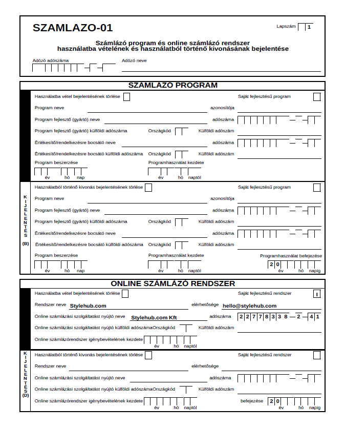 Ilyenkor a nyomtatványon a kijelentés részt kell kitölteni. A nav honlapján elérhető a szamlazo megnevezéssel rendelkező nyomtatvány mely elektronikus úton az ügyfélkapun keresztül illetőleg papír alapon nyújtható be az állami adóhatóságnak. Amennyiben a régi programot nem használod tovább úgy ezt is jelezned kell az adóhivatalnál. Az ányk programmal kell megnyitni és kitölteni a szamlazo nevű nyomtatványt ezt követően a kitöltött nyomtatvány elektronikusan beküldhető az ányk program segítségével vagy a már kitöltött és leellenőrzött.